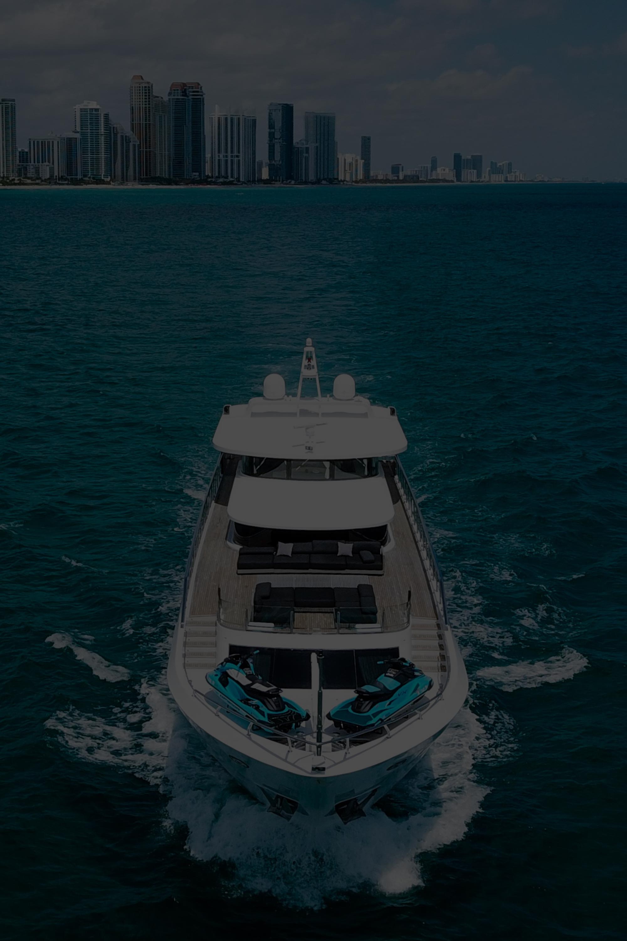 The yacht sets sail as the Miami sunset paints the skyline.